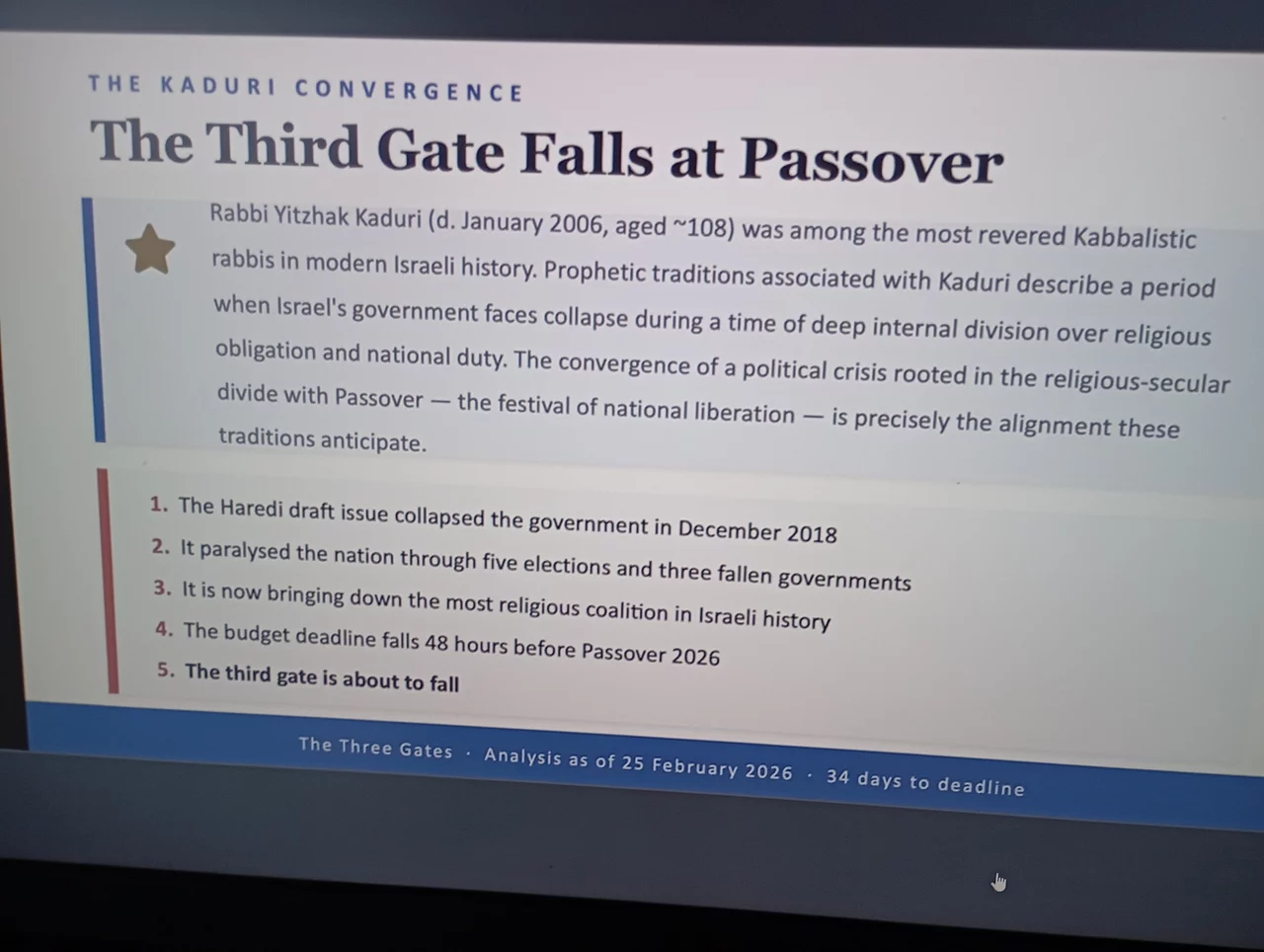 Abschließend verknüpft der Sprecher die politische Analyse mit den Kaduri-Prophezeiungen: Diese sagen eine Zeit der Regierungsinstabilität und tiefen inneren Spaltung Israels voraus, die genau mit dem Pessach-Fest der nationalen Befreiung zusammenfällt. Die „dritte Gate“-Phase, das finale Hindernis, steht unmittelbar bevor, und das, was die Krise ursprünglich ausgelöst hat, wird sie auch abschließen.